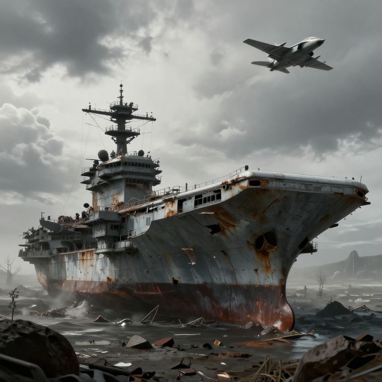 The image depicts a post-apocalyptic, fantasy-style concept art of an aircraft carrier, rendered in a realistic yet eerie manner. The carrier, painted in shades of gray and rust, shows signs of decay and damage, with its hull and superstructure appearing weathered and worn. The ship is anchored in a desolate, rocky landscape, with scattered debris and remnants of what once were likely part of the carrier's infrastructure. In the background, a lone fighter jet flies overhead, adding to the sense of abandonment and desolation. The sky is overcast, with thick clouds hanging low, casting a gloomy atmosphere over the scene. The overall composition is dynamic, with the carrier positioned centrally, drawing the viewer's eye to its intricate details and the surrounding debris. The interplay of light and shadow, along with the realistic textures of the carrier and the surrounding environment, creates a sense of depth and realism, despite the fantastical setting.