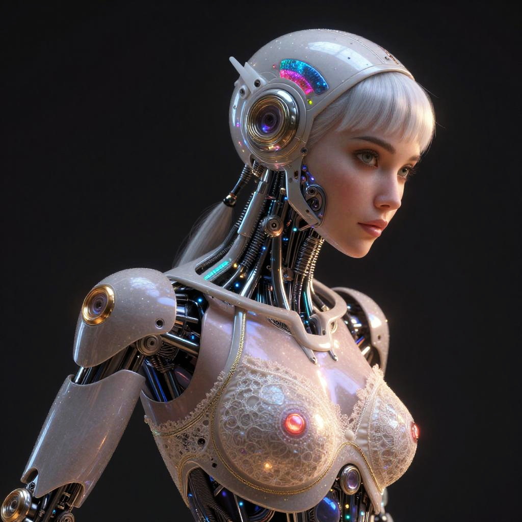 Photorealistic CGI of a female robot with silver hair, intricate white lace bra, and glowing mechanical eyes, set against a black background.