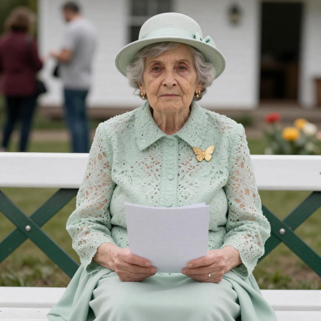 Elderly woman with gray hair, wearing a light green lace blouse and matching hat, holding a white paper. She sits on a white bench with a green railing. Background includes blurred people and a white house. Light green shawl draped over her lap. Gold butterfly brooch on blouse. Serious expression. Flowers in background.