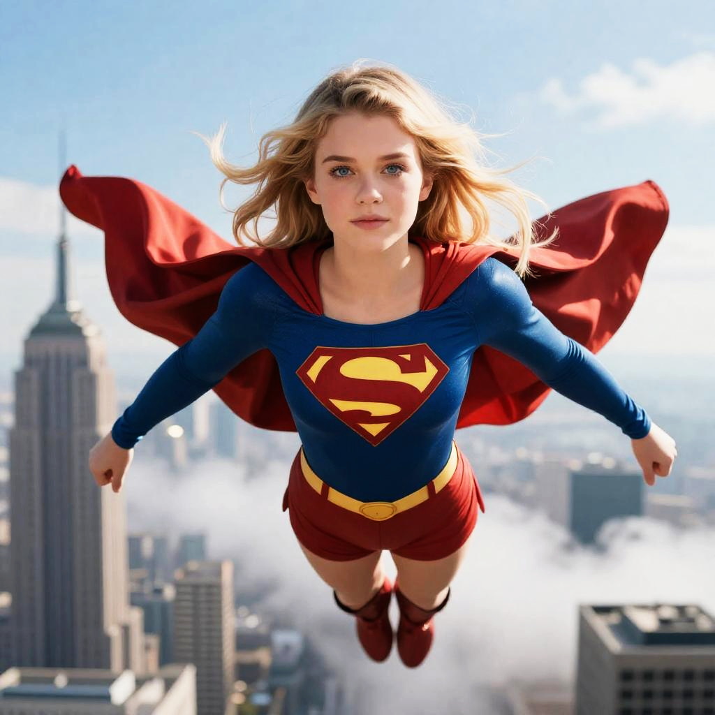 Highres, masterpiece, perfect ligthing, bloom, cinematic lighting, perfect skin, nice hands, [Erin Moriarty|Mischa Barton] as 18yo girl stand in superhero action pose fly in sky, blond long hair, blue eyes, front layers hairstyle, supergirl, cape, skyscrapers, clouds, clear sunny day