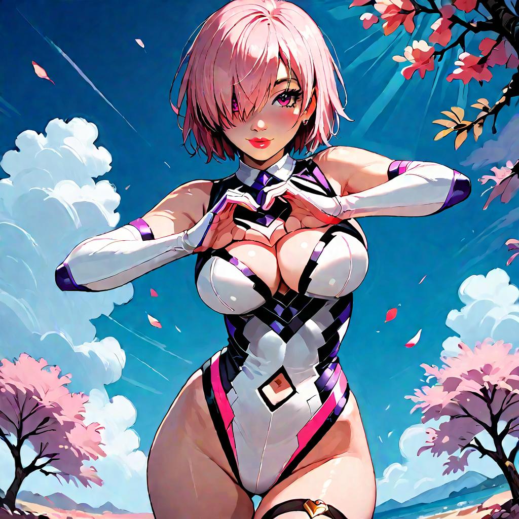 Score_9, score_8_up, score_7_up, source_anime 1girl, solo, looking at viewer, detailed background, Mash Kyrielight, pink hair, hair over one eye, large breasts, leotard, navel, thigh strap, elbow gloves, cleavage, smile, (outdoors, sunlight, cloudy sky), heart hands