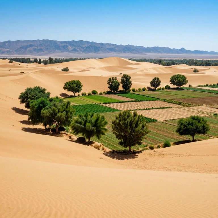 Oasis-like agricultural plots thrive amidst expansive golden sand dunes, bordered by lush green trees and structured fields, set against a backdrop of distant mountains under a clear blue sky.
