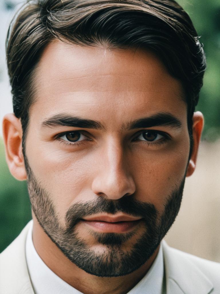 Photorealistic close-up headshot of a man wearing a light-colored summer wedding outfit. The man has well-groomed dark hair and a neatly trimmed beard, displaying a calm and serious expression. The background is softly blurred with natural greenery tones.