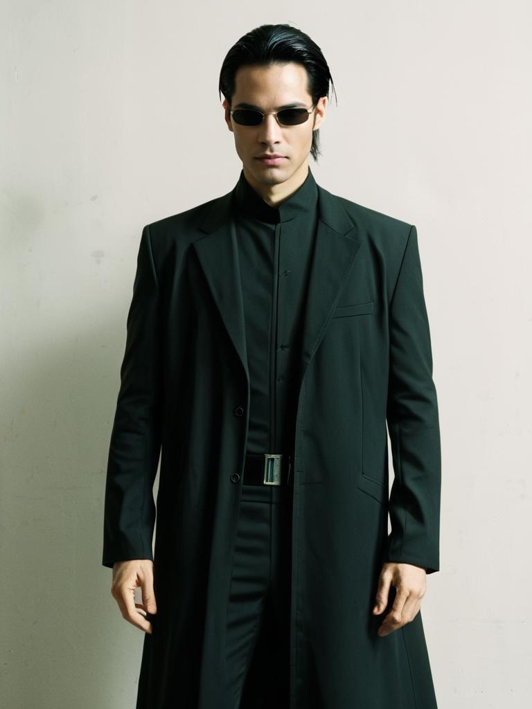 Man cosplay. Wearing Neo (The Matrix) costume. Realistic photo. Dressed as Neo (The Matrix) --sref 1400