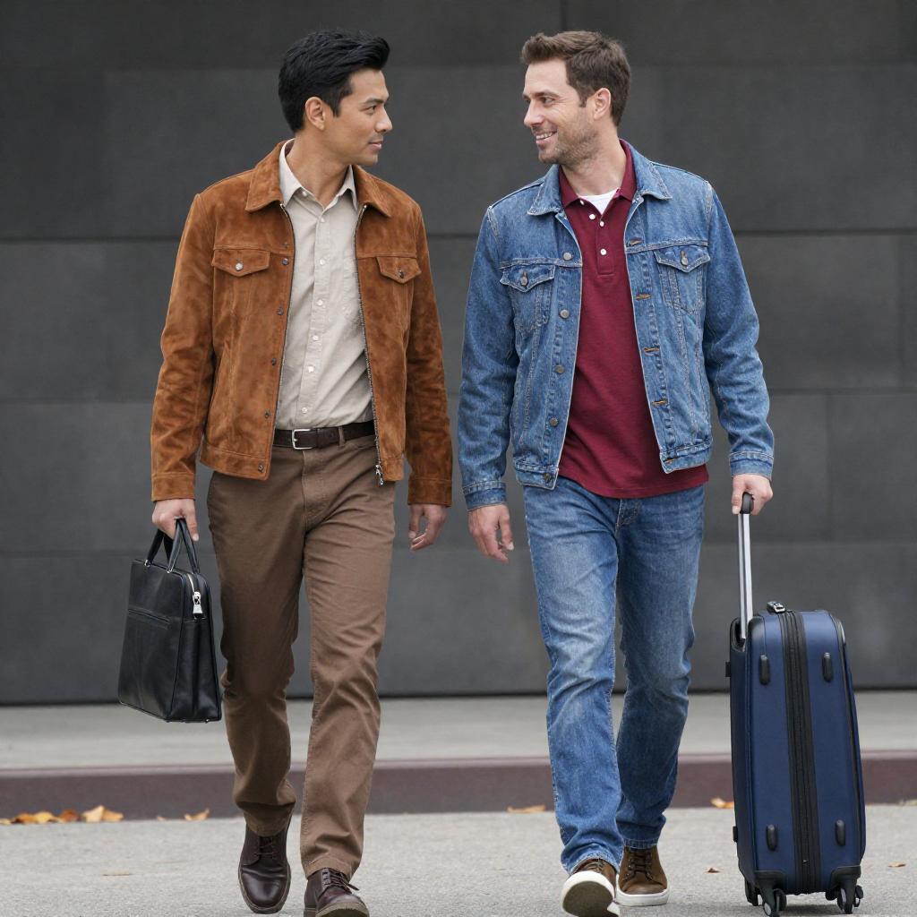 Photograph of two men walking outdoors. The man on the left has dark hair, wears a brown suede jacket over a beige shirt, brown pants, and holds a black briefcase. The man on the right has brown hair, wears a blue denim jacket over a red shirt, blue jeans, and carries a blue suitcase. They are walking on a path with fallen leaves and a dark stone wall in the background. The man on the right is smiling and looking at the man on the left, who looks down.