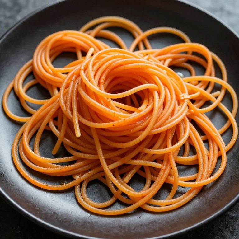 The image showcases a meticulously woven arrangement of spaghetti on a dark, round plate. The spaghetti strands are a vibrant orange, creating a visually striking contrast against the plate's dark surface. The noodles are intricately interlaced, forming a complex, almost organic pattern that appears both delicate and sturdy. The central cluster of spaghetti is tightly packed, while the surrounding strands spread out, creating a sense of depth and dimension. The plate, with its smooth, reflective surface, serves as a stark backdrop, enhancing the vividness of the spaghetti's color and texture. The overall composition is balanced, with the spaghetti's intricate weave drawing the viewer's eye across the entire plate, highlighting the artistry in the simple act of food preparation.