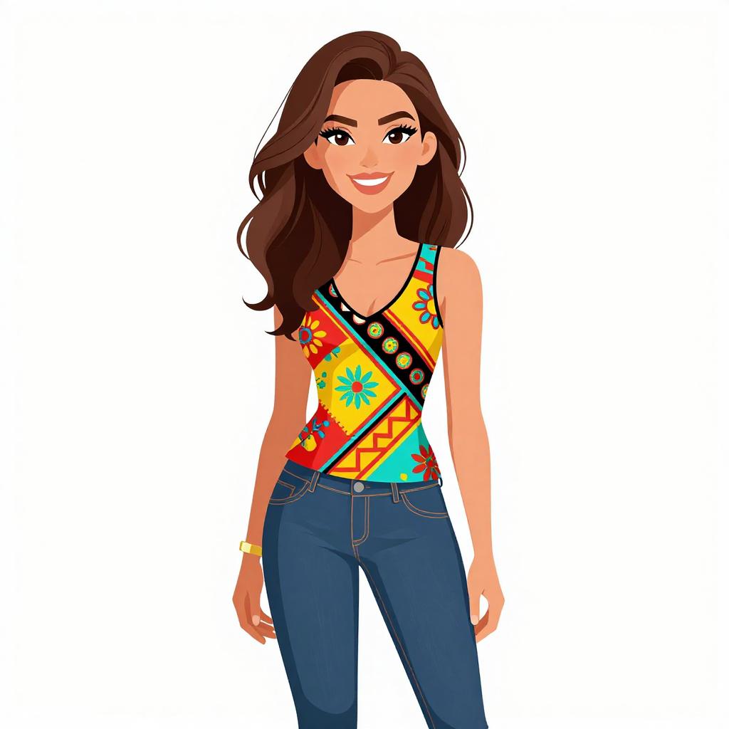 Woman with pretty face and pretty hair. smiling Woman, vibrant, sleeveless top with a mix of yellow, red, black, and turquoise geometric and floral patterns, scoop neck, asymmetrical bottom hem, denim jeans, fitted with slight flare at the bottom, gold cuff bracelet on one wrist. --sref 1467