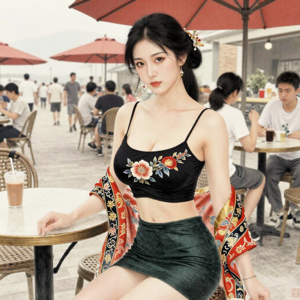 A lean woman in a chic white midi dress with a V-neckline and thigh-high slit, paired with black strappy heels and a black clutch, stands at a picturesque waterfall with a sunset backdrop, captured in a camera obscura style. Sexy. Pretty face and beаutiful eyes. Big breasts BREAK chinese, asian, traditional Chinese aesthetics, delicate brushwork, ink wash painting textures, vibrant red and gold accents, elegant Asian female, silk fabrics, ornate patterns, soft lighting, ethereal atmosphere