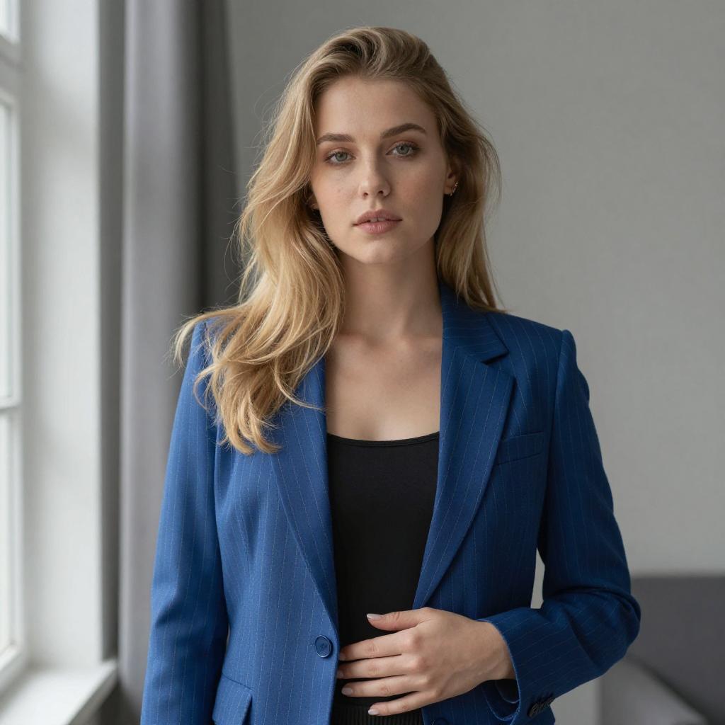 Photograph of a young woman with light brown hair in a loose updo, wearing a gray plaid blazer over a white top, standing beside a golden vintage gramophone. She rests her chin on her hand, smiling slightly, with the gramophone's horn prominently in the background.