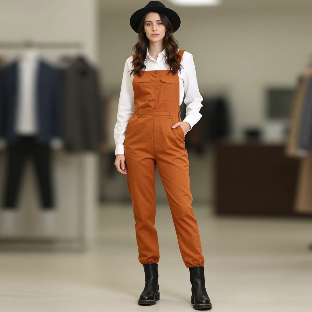 Woman chic work clothes, solo, 1girl, standing, boots, looking at viewer, brown hair, long hair, full body, shirt, closed mouth, black footwear, white shirt, orange jumpsuit, clothes around waist, hand in pocket, long sleeves, indoors, pocket, hat, jacket, blurry background, pants, blurry