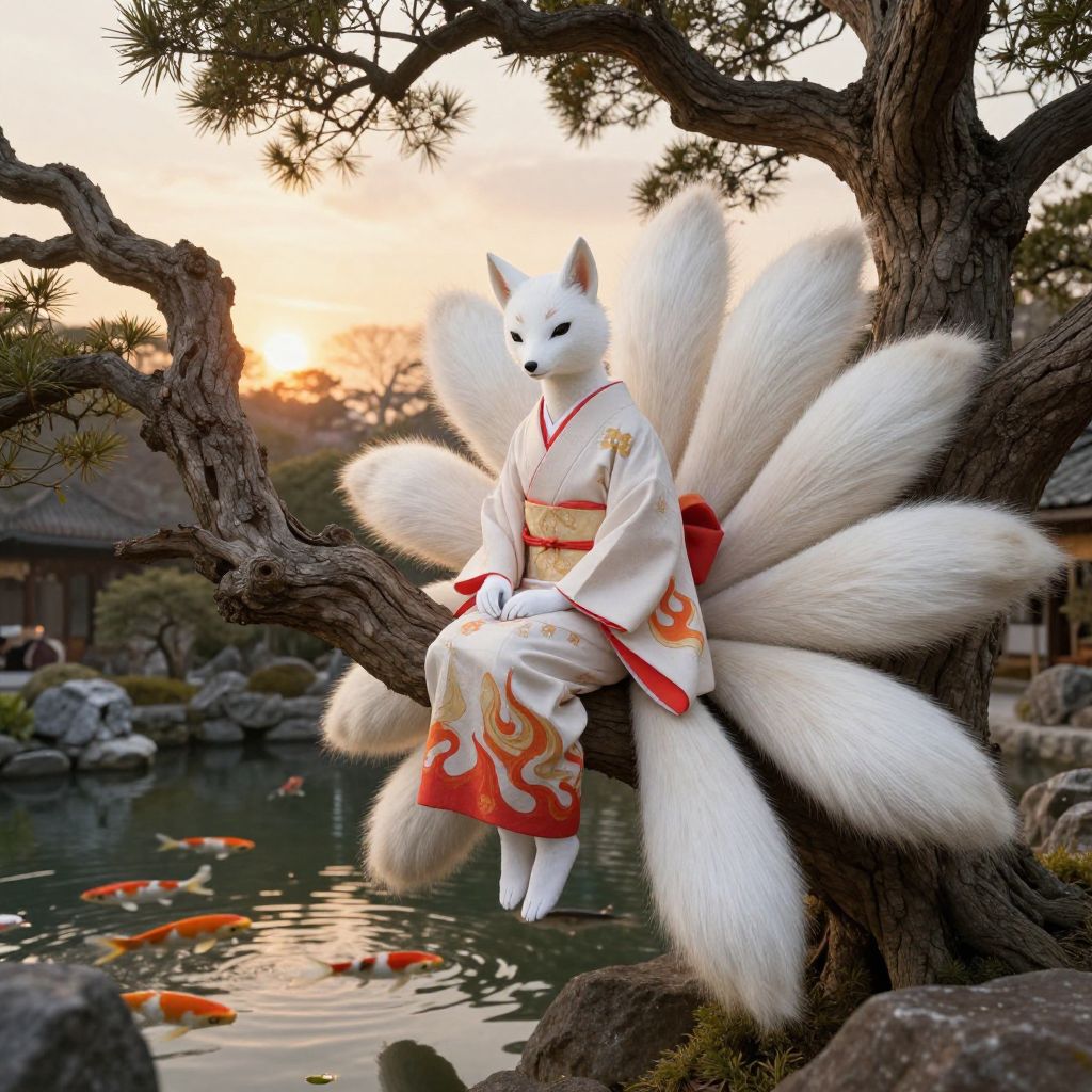 White haired kitsune perched on a twisted ancient tree branch above a tranquil koi pond, her nine fluffy tails cascading, wearing an elegant kimono with subtle flame motifs, soft sunset lighting creating a warm, magical ambiance in a secluded garden