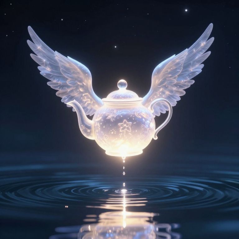 A luminous teapot adorned with ethereal wings hovers serenely above rippling waters, its spout dripping a cascade of radiant light into the starlit void.