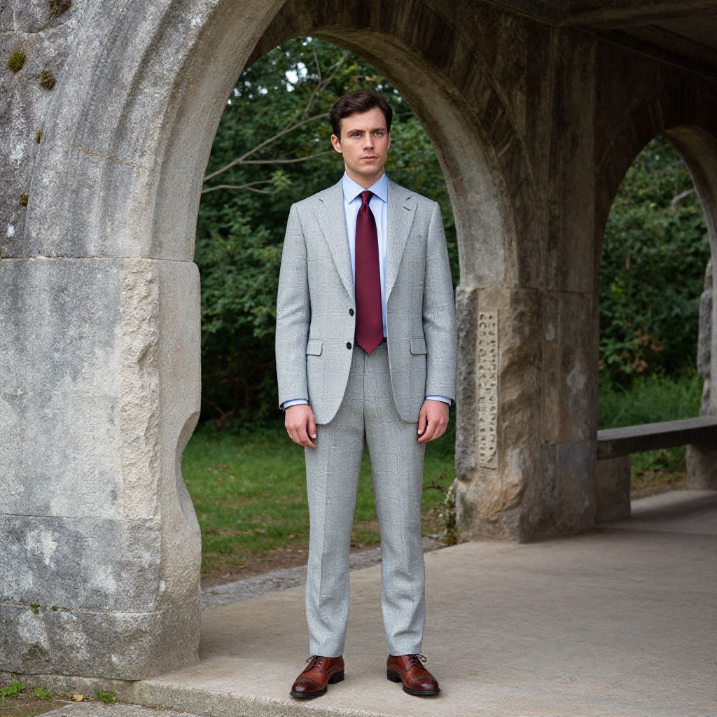 A man, light gray glen plaid suit, pale blue dress shirt, burgundy silk tie, brown leather brogues, standing under ancient stone arches, weathered inscriptions, lush green surroundings, anscochrome analog film style, contemplative expression. Man has masculine face and piercing eyes