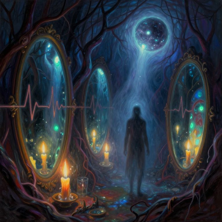 This digital painting depicts a surreal, dark cavern with a mystical ambiance. Two ornate, oval mirrors with glowing reflections of a serene, ethereal face are positioned on either side. The mirrors are illuminated by four red candles, their flames casting warm light against the deep blue and purple hues of the cavern. Above, a luminous blue ECG-like line pulses, adding a futuristic element. The background is shrouded in mist, with additional faint candlelight dotting the distance. The cavern walls are twisted and organic, resembling veins. The artwork blends elements of fantasy and science fiction, with a dreamy, otherworldly atmosphere.