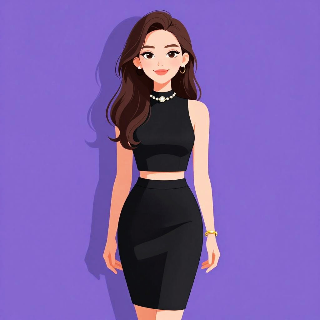 Woman with pretty face and pretty hair. Woman, chic, navy blue ribbed bodycon dress, short sleeves, mid-thigh length, crew neckline, black leather crossbody bag, thin strap. --sref 1467