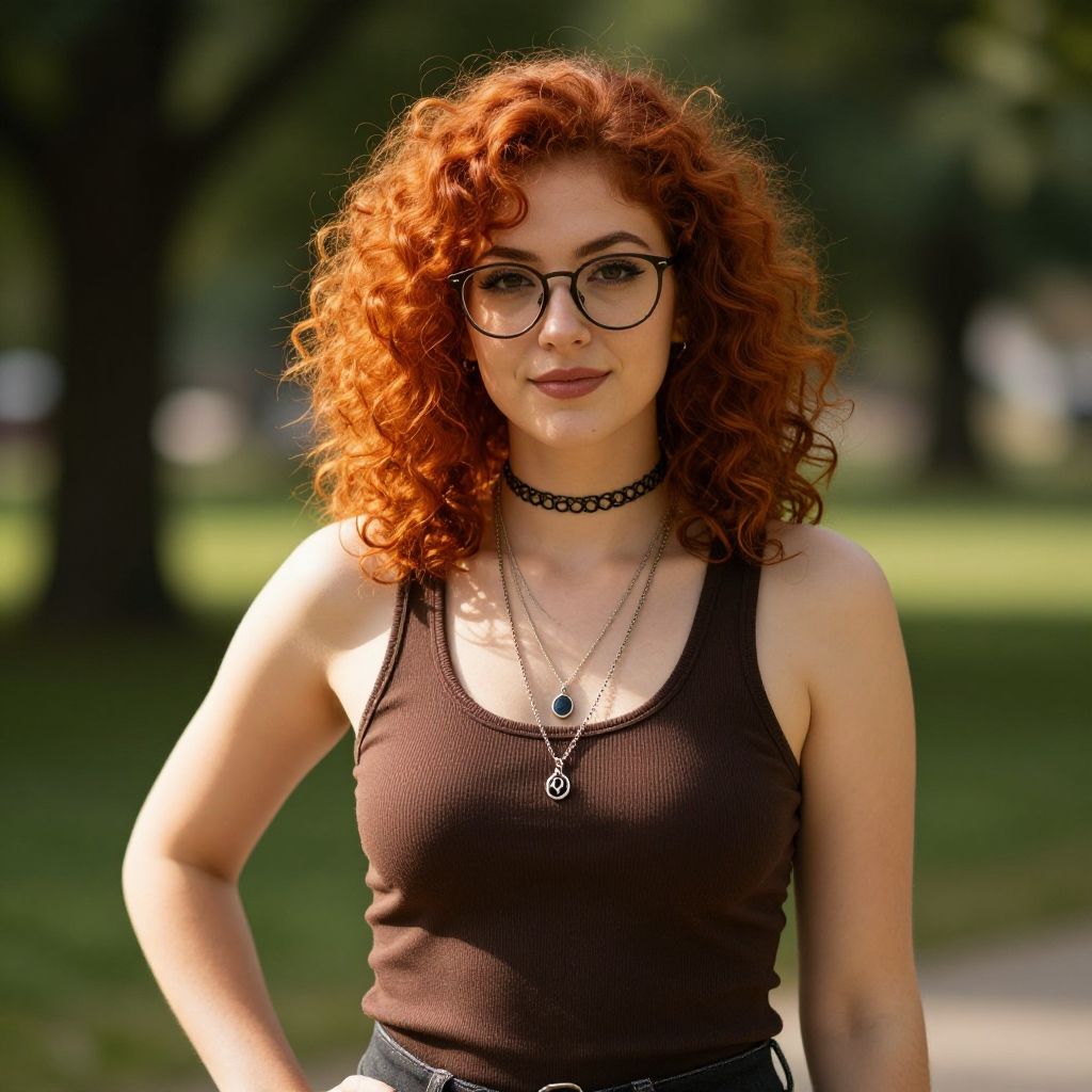 Photograph of a young woman with curly red hair, fair skin, and black t-shirt, standing in a colorful graffiti alley.