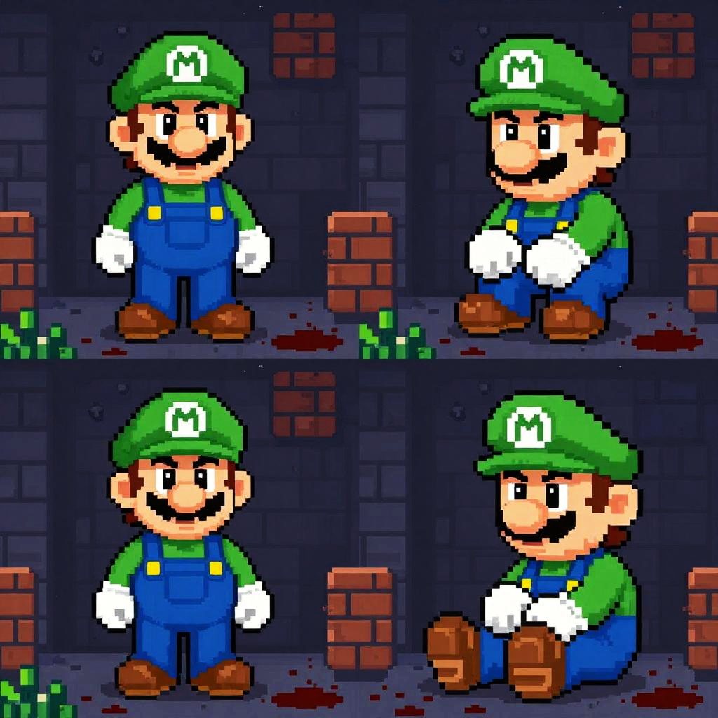 This is a pixel art collage in four panels showing Mario, a mustachioed plumber in green overalls and hat, standing in a dimly lit, grimy, brick-walled hallway with blood splatters. In the top-right panel, Mario is crouched, looking worried. In the bottom panels, he's standing and then sitting on the floor, looking distressed. The lighting is low, creating a tense atmosphere. The artwork has a retro, 8-bit video game style.