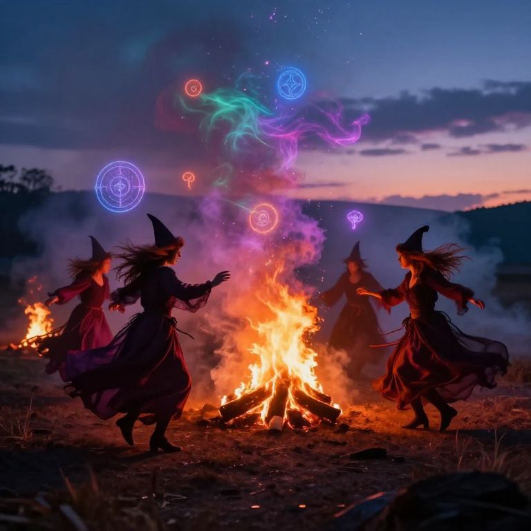 Photograph of four silhouetted witches dancing around a fiery campfire at dusk, with glowing blue and purple magical orbs in the sky.