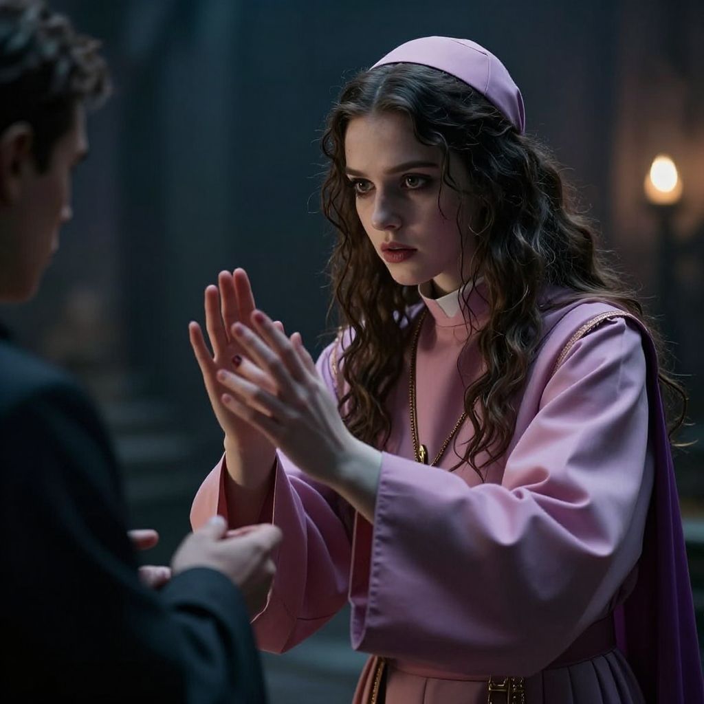 Dora the Exorcist! 20 year old Dora is now an Exorcist, Dora the Exorcist is seen in pink and purple priest's/ exorcist's smock standing near a second person in the scene, who appears to be possessed by a demon, Dora is performing the exorcism! Possessor, no possessing, Possessor no possessing, Possessor, no possessing! We did it! :dark, intense, dramatic spiritual-horror, photorealistic, perfectly realistic, perfect hands, perfect anatomy, ultra high definition, Getty Images quality, highest quality, ultrarealistic, perfect composition, cinematic spiritual-horror, fangoria cover image, sharp focus, intricate details, very highly detailed, from slightly twisted experimental angles, experimental lighting, rule of thirds, complex shadowing, anxious lighting, bokeh, intense cinematic image, highly detailed, psychologically stimulating, Zeiss Master Prime Lenses, Panavision, Film Stock Footage, with an ultra fast lens at 85mm f/1.4, perfect photograph, magnificent, ethereal, epic, shocking, epiCRealism, Ellis-RealismBoost