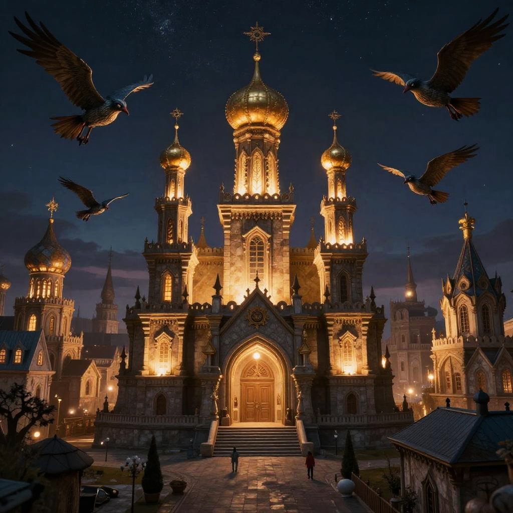 Пример фентезийного города под названием «рґрѕс‚а», с величественными башнями, волшебным светом, и фантастическими существами, летающими над городом в ночном небе.