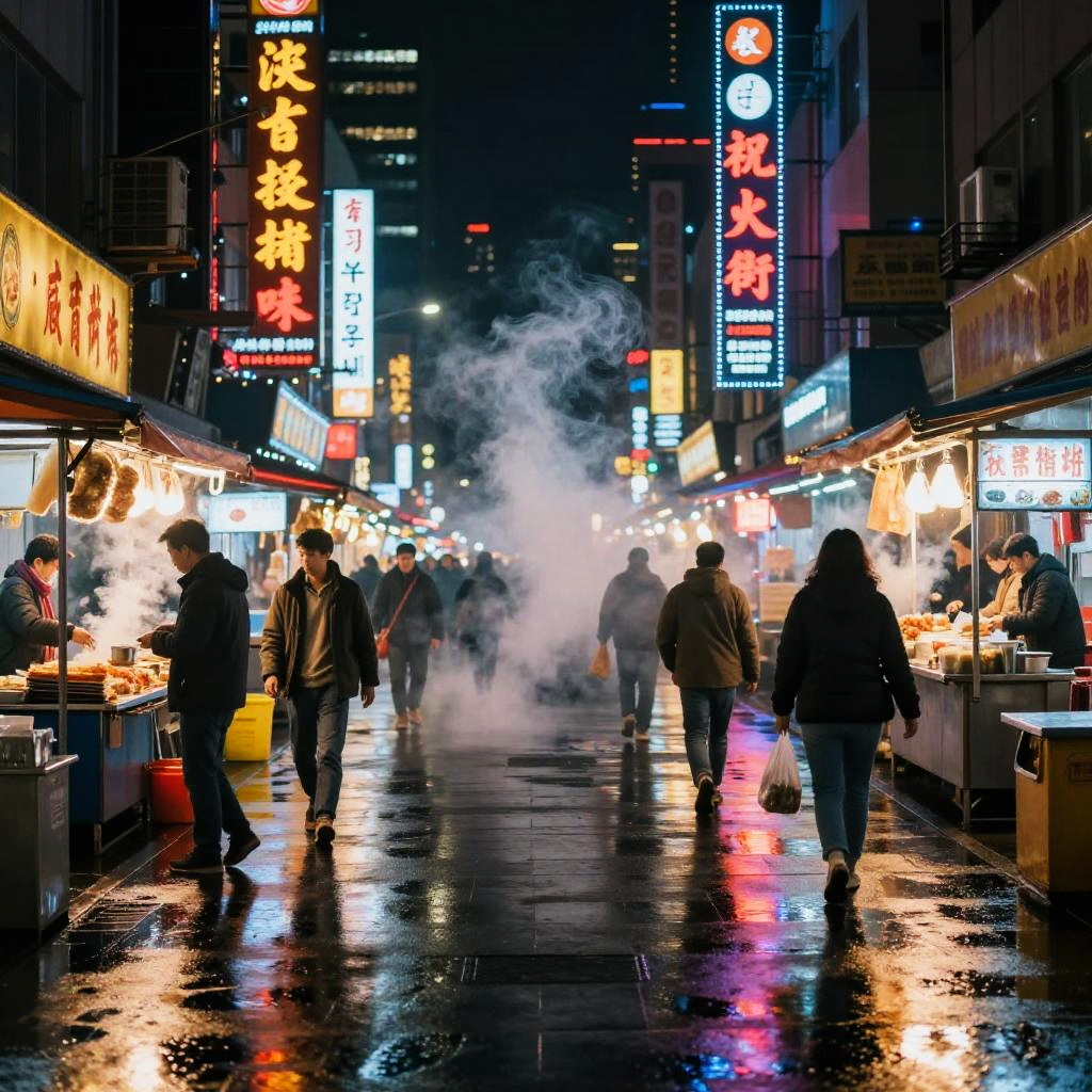 Photograph of a bustling, neon-lit night market street. Vibrant signs in Chinese characters and English illuminate the scene with red, yellow, and blue lights. Steam rises from food stalls on either side, with vendors and customers in winter clothing. The wet, reflective pavement glows with colorful reflections from the signs. People walk through the center, some carrying bags. The background shows tall buildings, adding depth to the urban setting. The overall atmosphere is lively and dynamic, capturing the essence of a vibrant, nighttime street market.