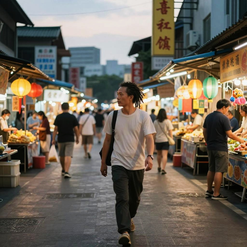Nighttime photograph of a busy, rain-soaked street market with neon signs, steam rising, and people walking past brightly lit food stalls. Vibrant
