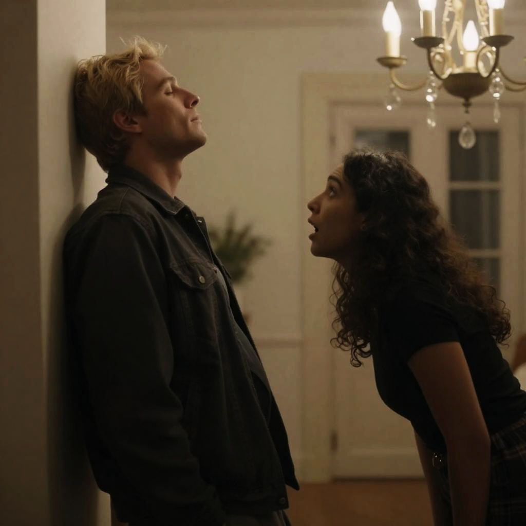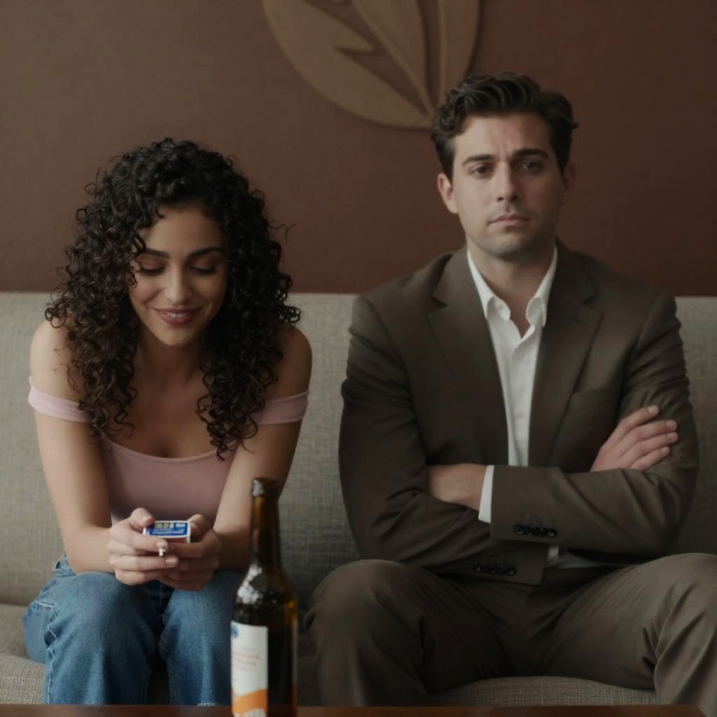 Photograph of a dimly lit basement with concrete walls. A man with short brown hair, wearing a dark shirt and beige pants, sits on a green stool. A woman with curly brown hair, wearing a white tank top and blue jeans, sits on a cushion against the wall. A small table with a cup and book is on the floor between them. The man looks at the woman, who gazes downward. Two wall-mounted lights illuminate the scene. The woman's expression is neutral, and the man's expression is calm.