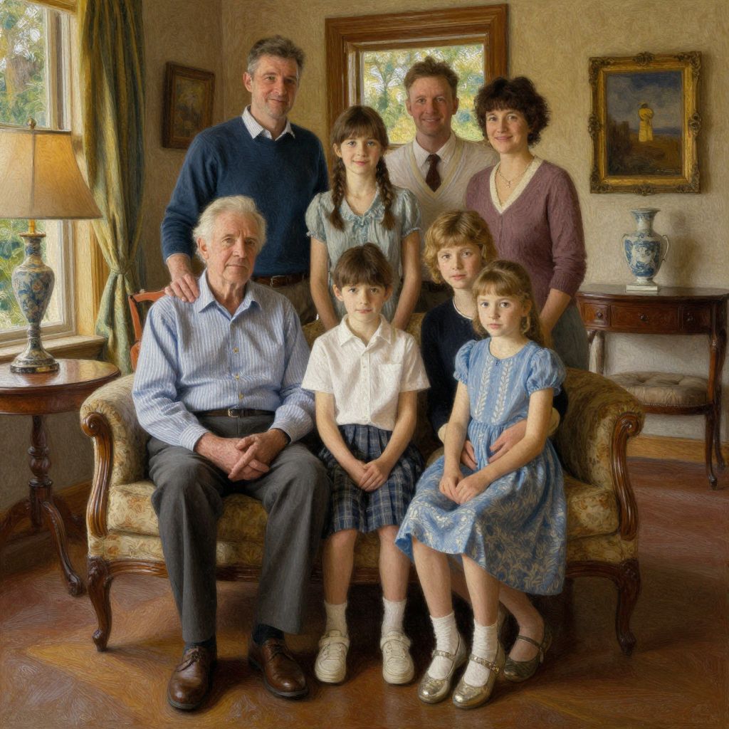 Fams multi-generation family portrait in a classic living room, warm and inviting atmosphere, traditional furniture, soft natural light from window, smiling faces of grandparents, parents, and children, impressionist style with rich texture