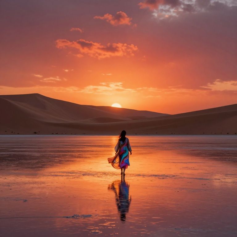 A solitary figure traverses an infinite expanse of shimmering, reflective terrain under the twilight sky, in a surreal and impressionistic desert landscape. The traveler dons an ethereal garment, adorned with swirling, vivid designs that animate as it sways with each step. Majestic sand dunes loom in the distance, their elongated silhouettes stretching across the ever-transforming ground, creating a mesmerizing panorama of endless dimensions. As the sun descends, its warm embrace bathes the heavens in a tapestry of fiery oranges and reds, which mirror onto the glass-like surface below, casting an enchanting ballet of light and color that simultaneously isolates and unites the wanderer with the vast celestial expanse above.