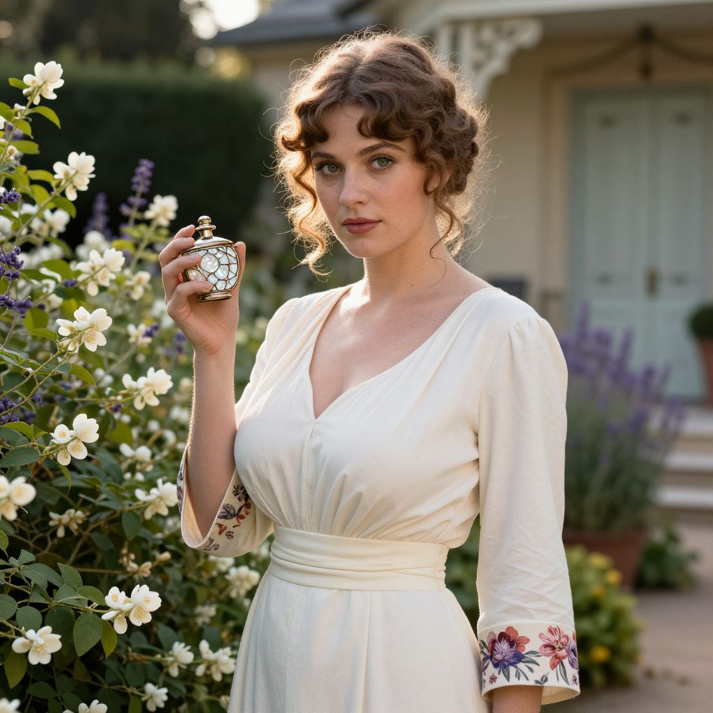 A highly detailed portrait of a vintage perfumery girl in a woman costume, standing among a garden of blooming jasmine and lavender in a grand 1930s French house garden. She has a serene expression, deep green eyes, and a natural look with full lips. Dressed in a soft ivory gown with a high waist and floral cuffs, she holds a vintage atomizer adorned with mother-of-pearl in her hand, with a subtle feminine glow in the golden hour light.. The woman has big tits and cute face