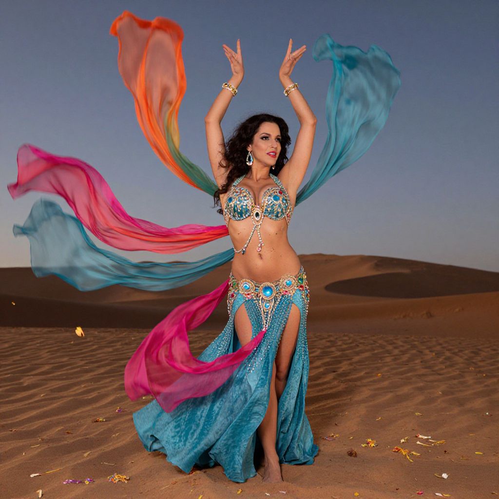 Vibrant Bellydancer Amidst Desert Twilight