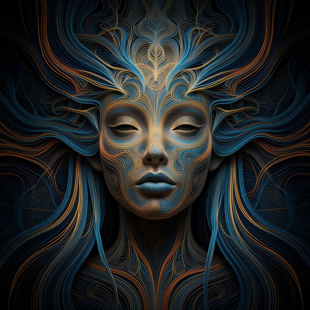 Digital artwork of a serene, intricate face with glowing blue and orange lines resembling waves, set against a dark background.