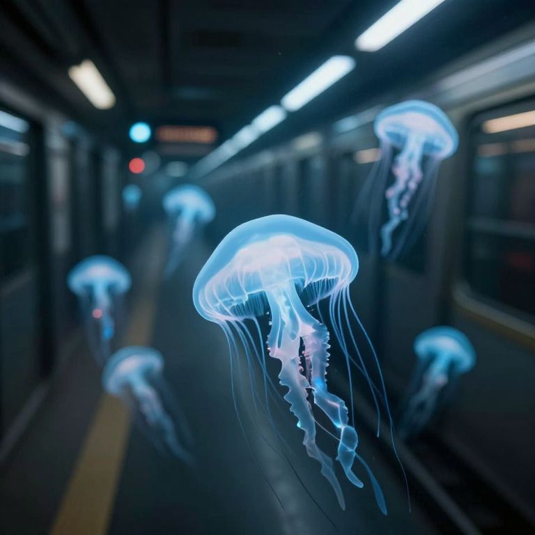 A translucent jellyfish herd glides silently beneath the streets, pulsing softly where subways once ran, now replaced by their hypnotic, bioluminescent migration.