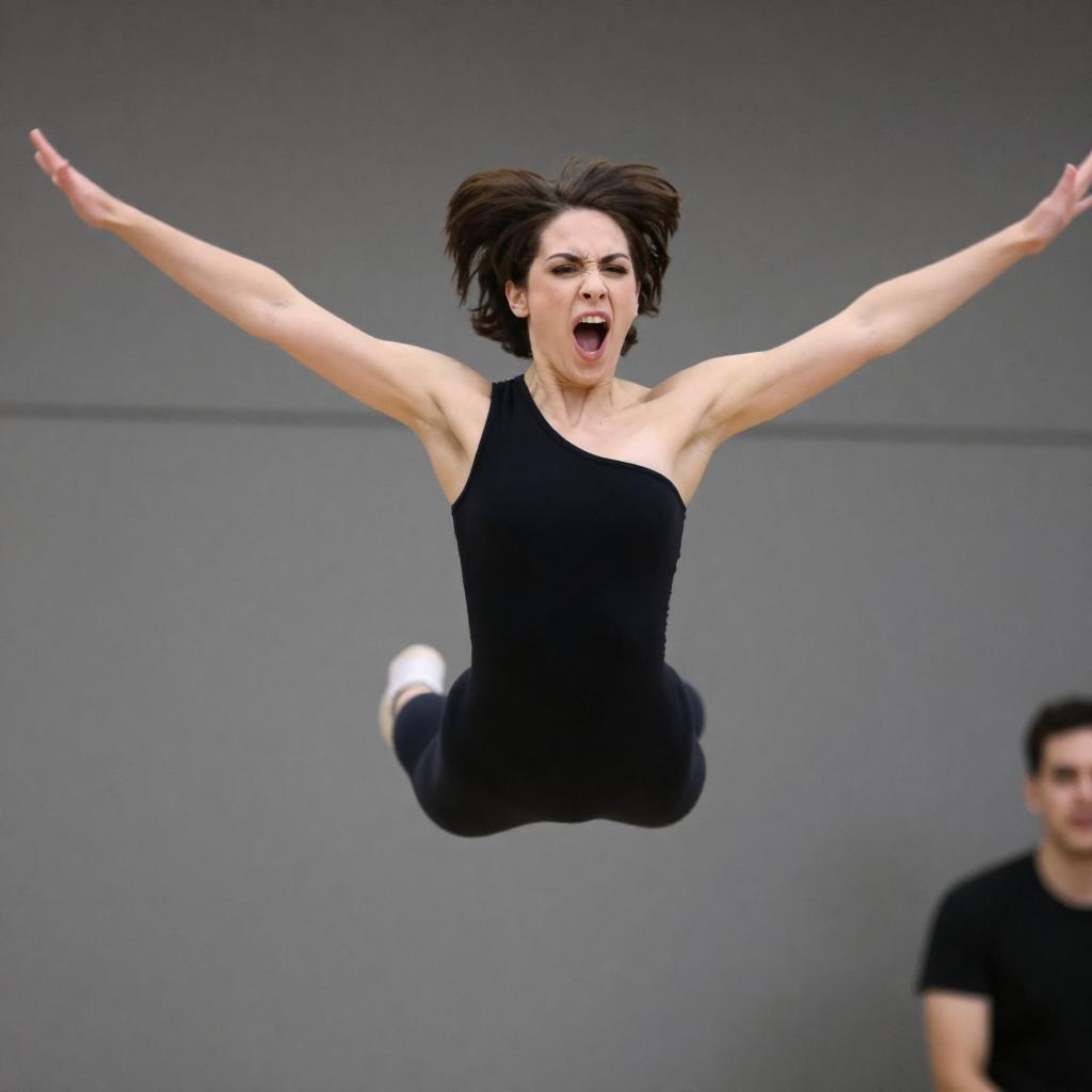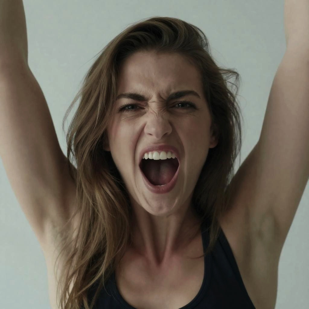 Photograph of a woman with long brown hair, wearing a red long-sleeve top, crawling on sandy ground. She has a determined expression, gritted teeth, and her right hand is forward while her left hand is behind. Her legs are spread out behind her. The background is a sandy, barren landscape. She is wearing sandals.