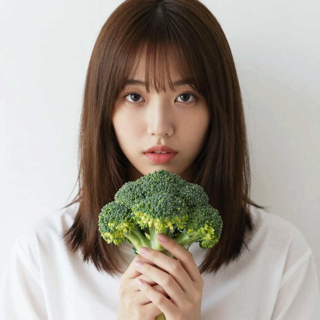 Photograph of an East Asian woman with straight, shoulder-length brown hair and bangs, gazing directly at the camera. She has fair skin and is wearing a plain white shirt. Her hands, with neatly manicured nails, are holding a small, fresh green broccoli head close to her face. The background is pure white, making the subject stand out prominently. The image is brightly lit, highlighting the woman's delicate features and the vibrant green of the broccoli.