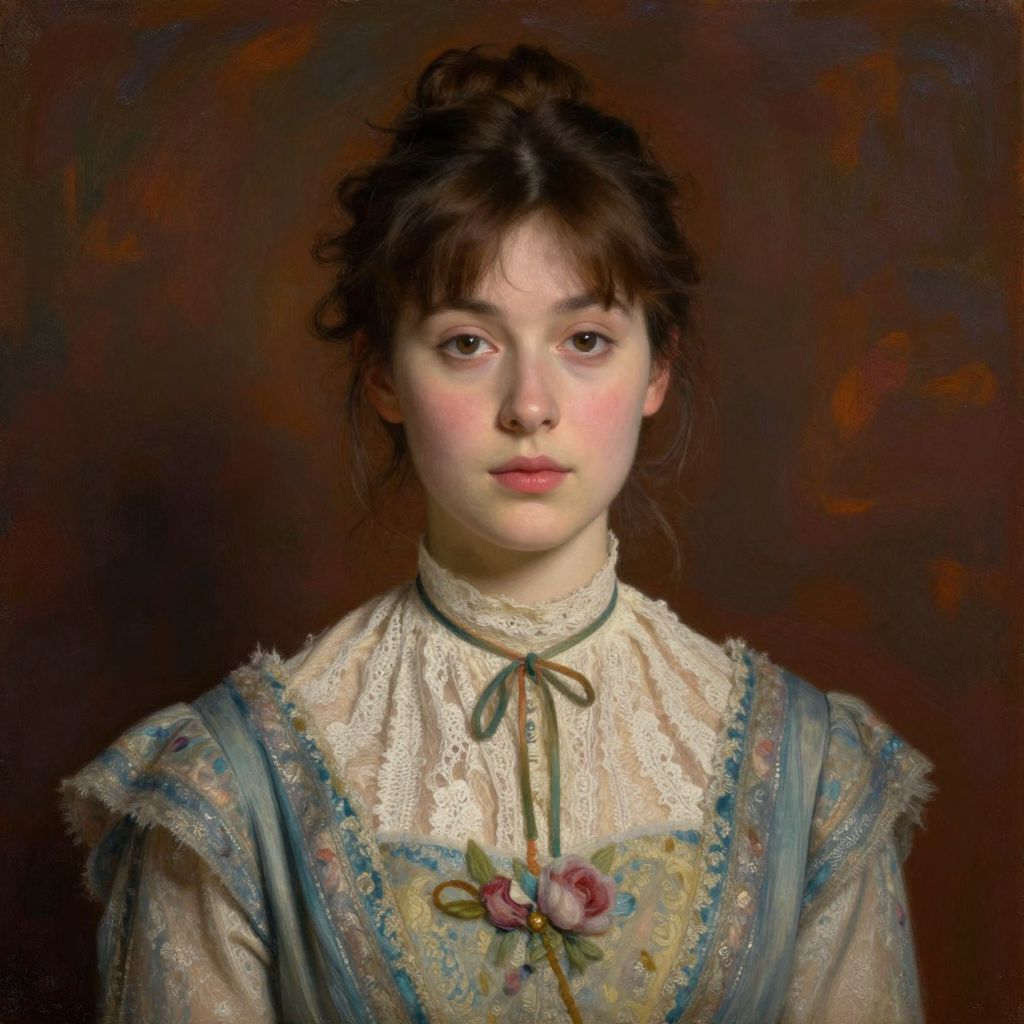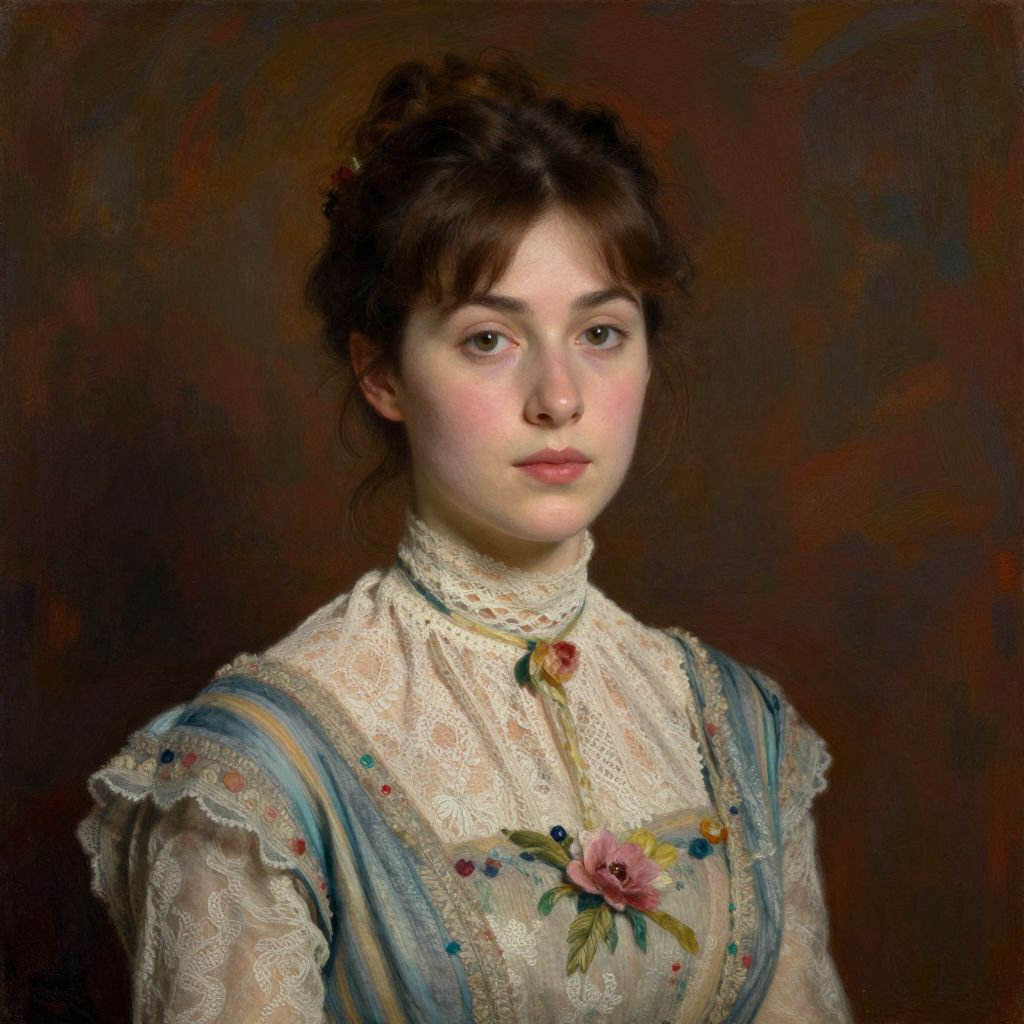 A finely detailed digital portrait reminiscent of Stanley Spencer's style, featuring a woman in a vintage-inspired dress with intricate lace detailing and floral accents, set against a richly textured, moody background that evokes a classic, high-definition artistic aesthetic.
