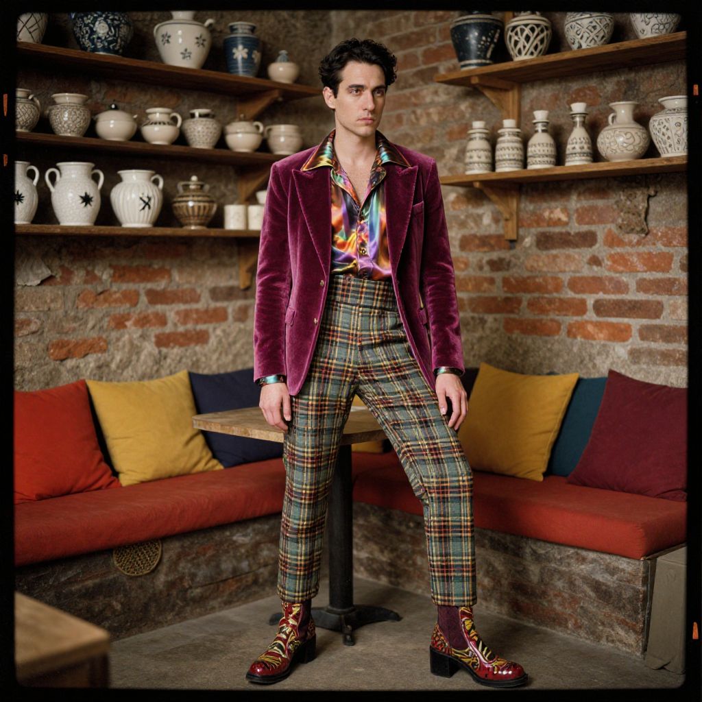Photograph of a stylish man standing in a rustic room with exposed brick walls. He has dark curly hair and wears a vibrant purple velvet blazer over a multicolored shirt, paired with plaid trousers and shiny brown lace-up boots. He stands confidently with his hands by his sides. Behind him, wooden shelves display a variety of white and patterned ceramic pots and jugs. The background features a red, yellow, and blue cushioned bench. The image has a slightly vintage, high-contrast filter, adding a dramatic effect.
