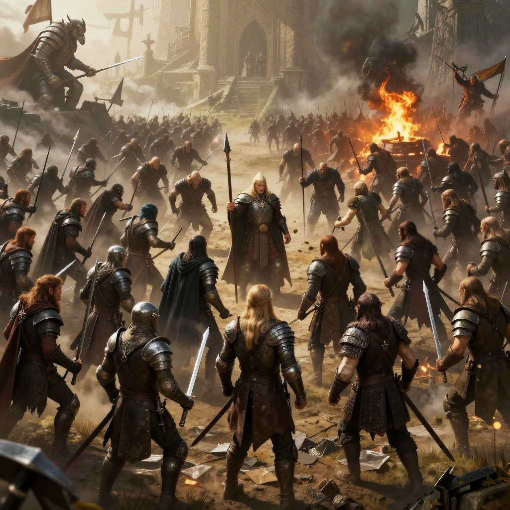 Epic digital artwork of a chaotic medieval battle with armored warriors clashing, fiery explosions, smoke, and a grand cathedral backdrop.