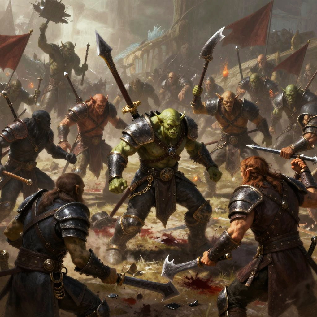Lord of the Rings AI art, a panoramic battle scene between armies of elves and orcs on a misty battlefield, epic scale, dynamic poses, rich color palette dominated by earth tones and fiery glows, cinematic perspective, detailed armor and weapons.