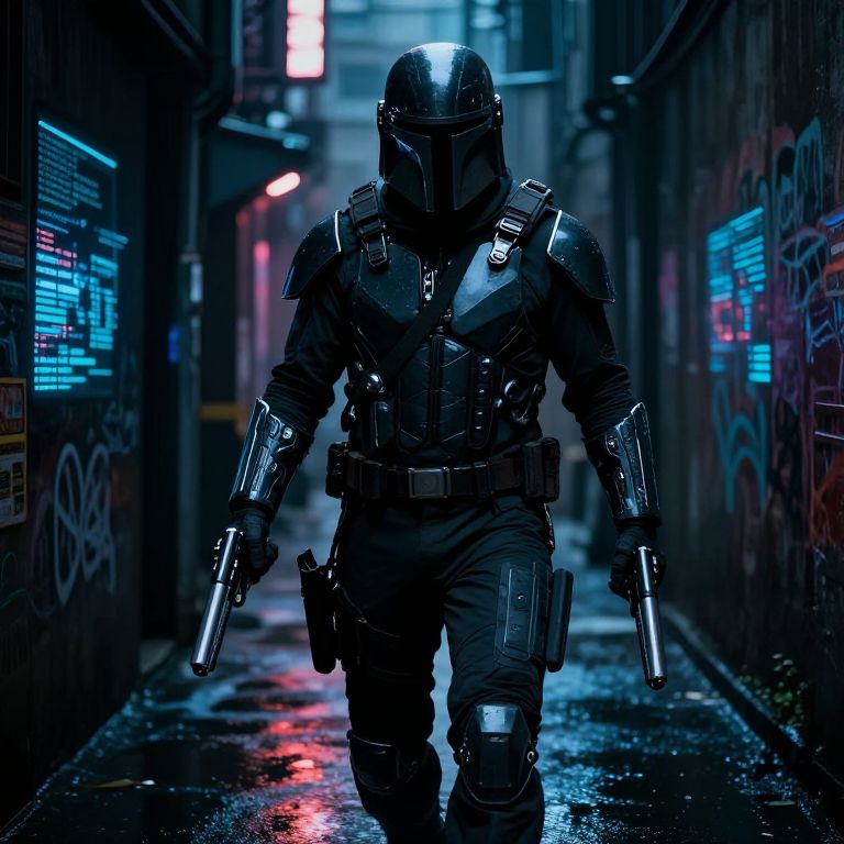 Digital art of a dark, futuristic alley at night. A black-armored, faceless bounty hunter with a glossy helmet, shoulder pads, and chest plates walks down the wet, glistening street. He holds a dual-wielding handgun in each hand, with a holster on his right thigh. Neon blue and pink lights illuminate the graffiti-covered walls, casting a cyberpunk glow. The bounty hunter's stance is determined, with a focused gaze despite the helmet's obscurity. The alley's narrow perspective and reflections enhance the dramatic, high-tech atmosphere.