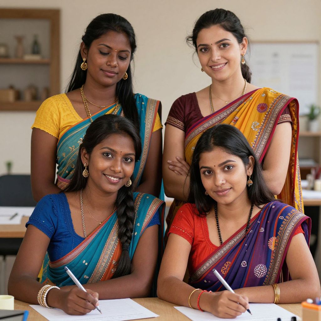Photograph of four Indian women in a classroom. Three women stand behind a fourth who is seated and writing. All wear colorful traditional sarees with gold borders, and the seated woman also wears a blue blouse. The woman on the left wears a yellow saree, the woman on the right wears a maroon saree, and the other two wear blue and red sarees respectively. They have dark hair, wear gold jewelry, and smile at the camera. The background shows a blurred classroom with shelves and a window. The image is brightly lit and vibrant.