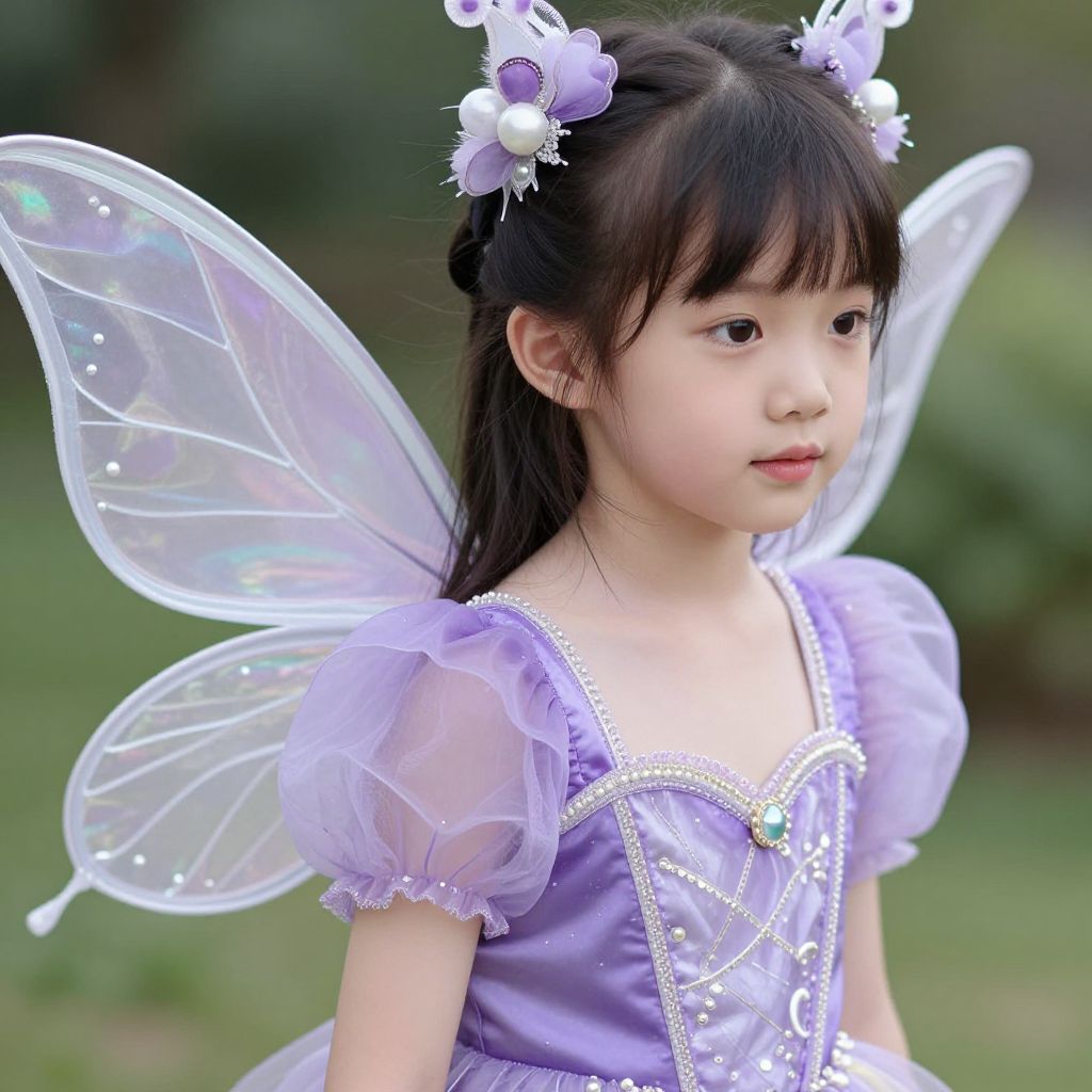 Photograph of an Asian girl with fair skin and long black hair, wearing a lavender fairy costume. The dress has puffed sleeves and a sparkling bodice with a green gem at the center. She has translucent, winged fairy wings adorned with white dots and a floral headband with purple and white flowers. She stands against a blurred green outdoor background. Her expression is neutral, with slightly parted lips, and she gazes to the right. The image has a soft, magical, and whimsical feel.