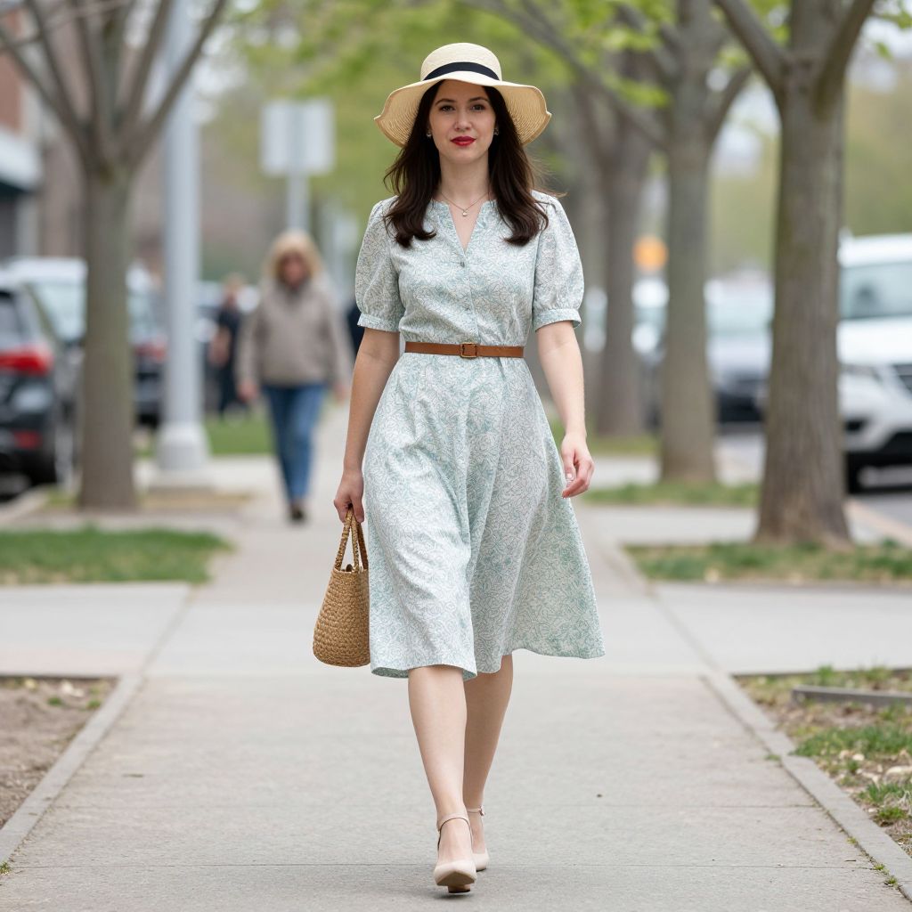Spring Costume, woman in a hat and dress walking down a sidewalk