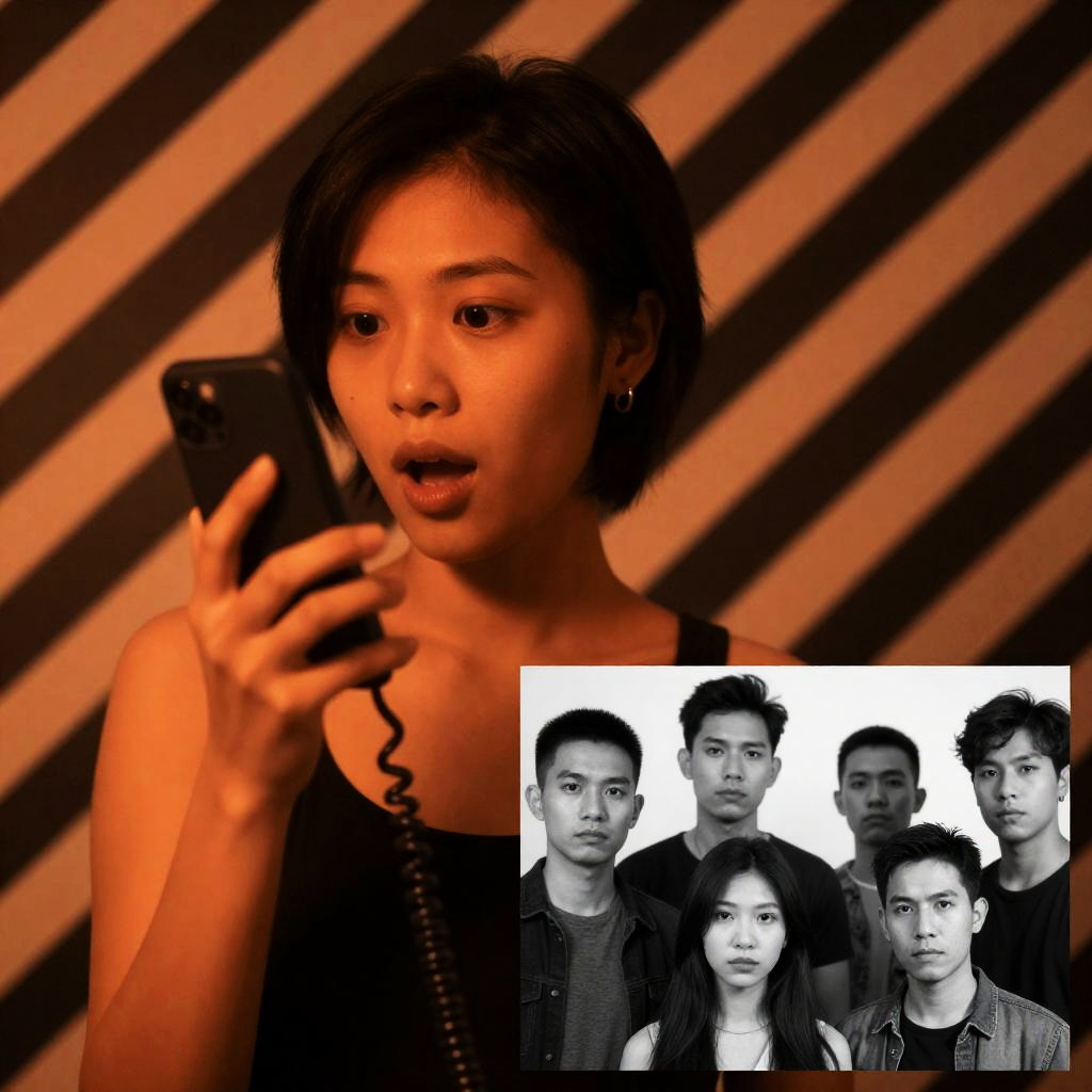 Photograph of a short-haired woman holding a black corded phone, orange-tinted, looking surprised. Diagonal black and orange pattern background. Black-and-white inset photo of four people in the lower right, serious expressions. Woman's left ear earring visible.