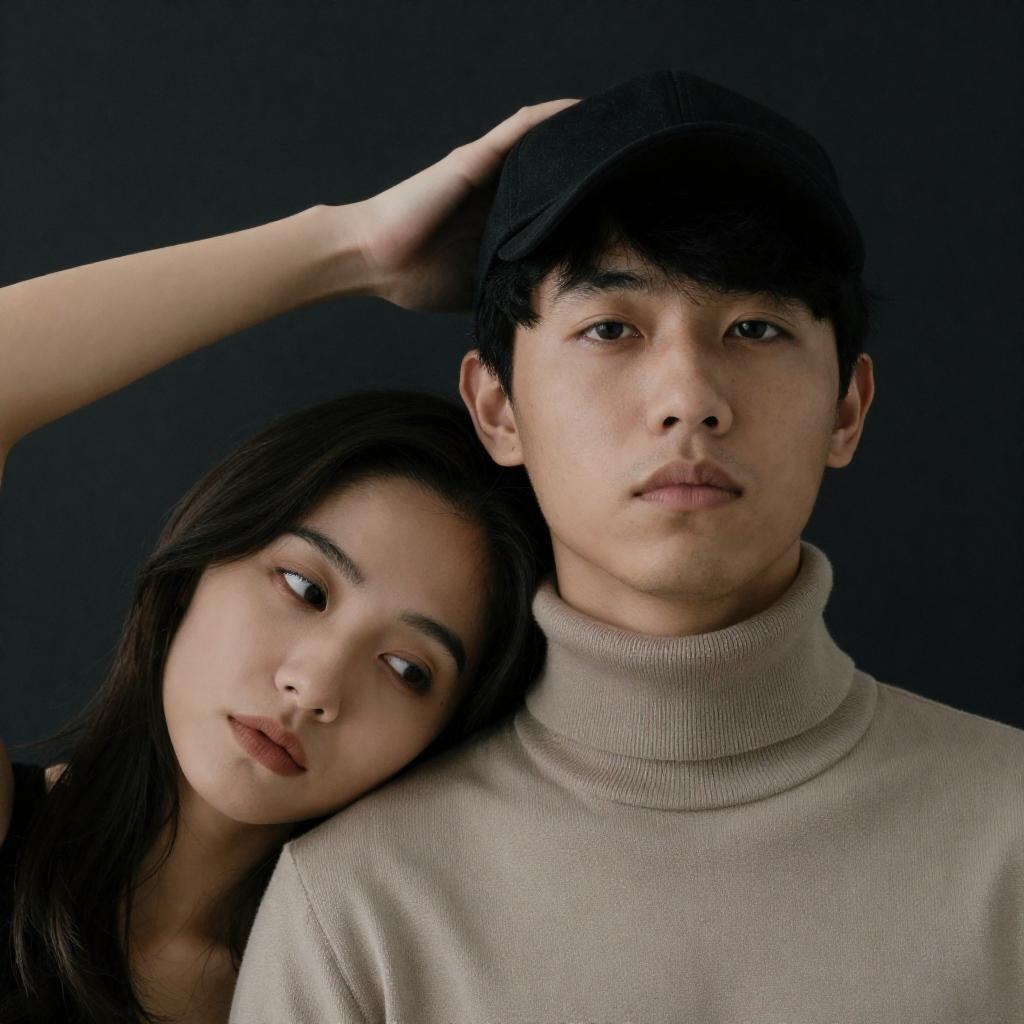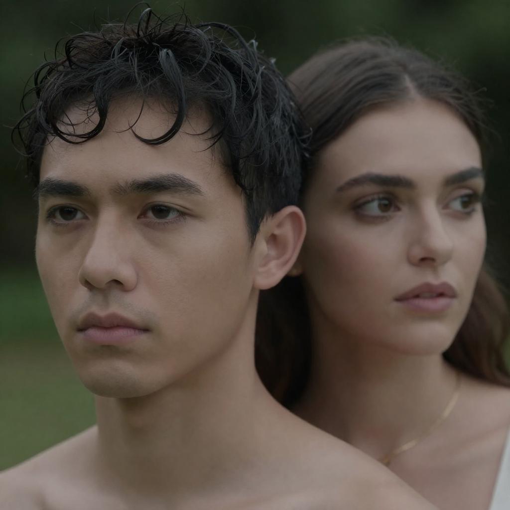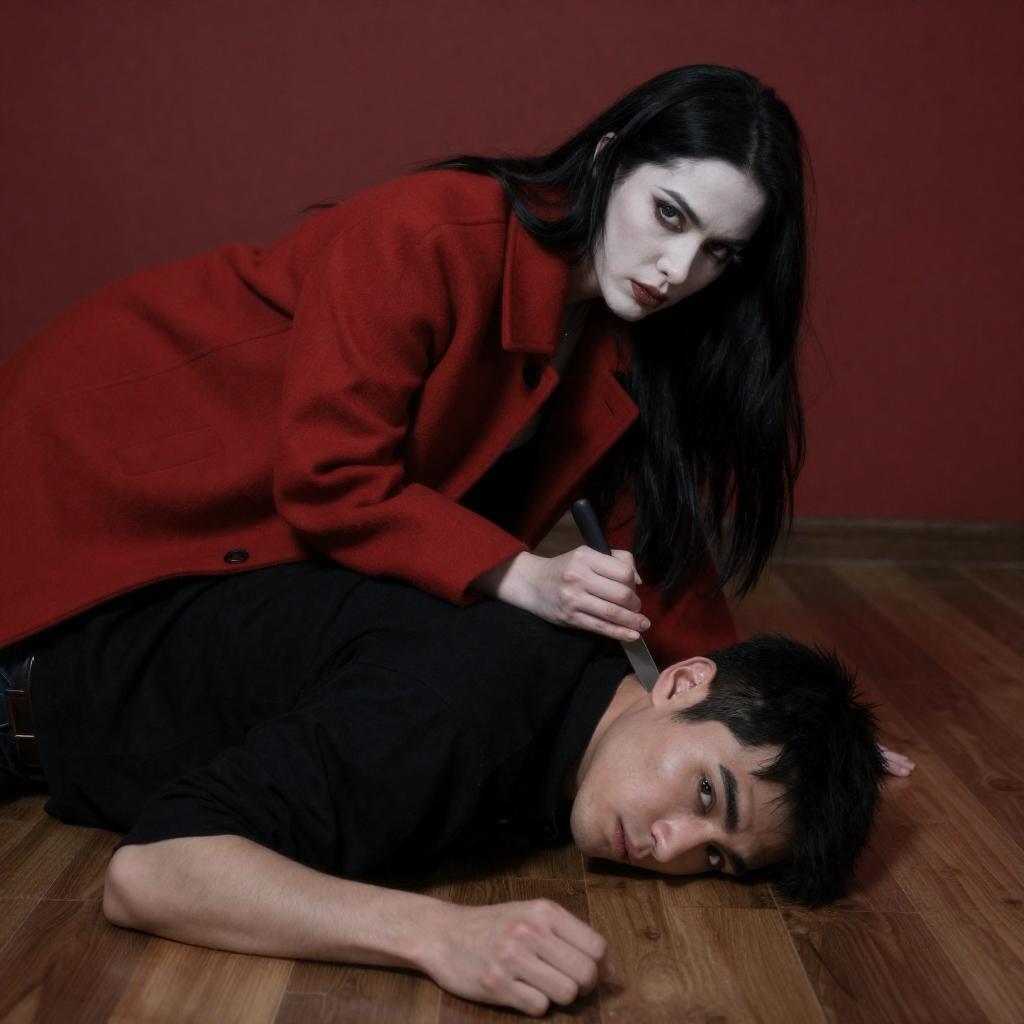 Photograph of two people. Woman with pale skin, black hair, red coat, holding knife, straddling man with medium skin, black hair, black shirt, lying on wooden floor. Knife near man's neck. Background: red, leaf-patterned ure. Intense expressions.