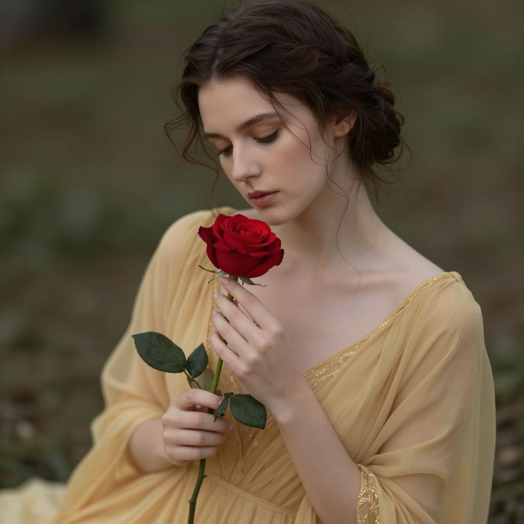 Enveloped in the timeless elegance of her golden gown, the woman cradles a vibrant rose, embodying a delicate balance of serenity and introspection, as the soft fragrance of the bloom whispers tales of transience and enduring beauty.
