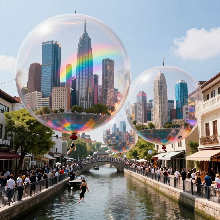 Photograph of a vibrant urban scene featuring a canal lined with cafes and shops on both sides. Large, iridescent soap bubbles float in the air, reflecting a rainbow of colors. The background showcases a modern city skyline with tall, colorful skyscrapers under a bright blue sky. Crowds of people stroll along the canal's stone pathways, some sitting at outdoor tables. The water in the canal is calm, reflecting the scene above. The image combines elements of urban life and whimsical beauty, with the soap bubbles adding a playful, magical touch.