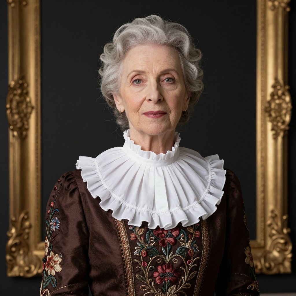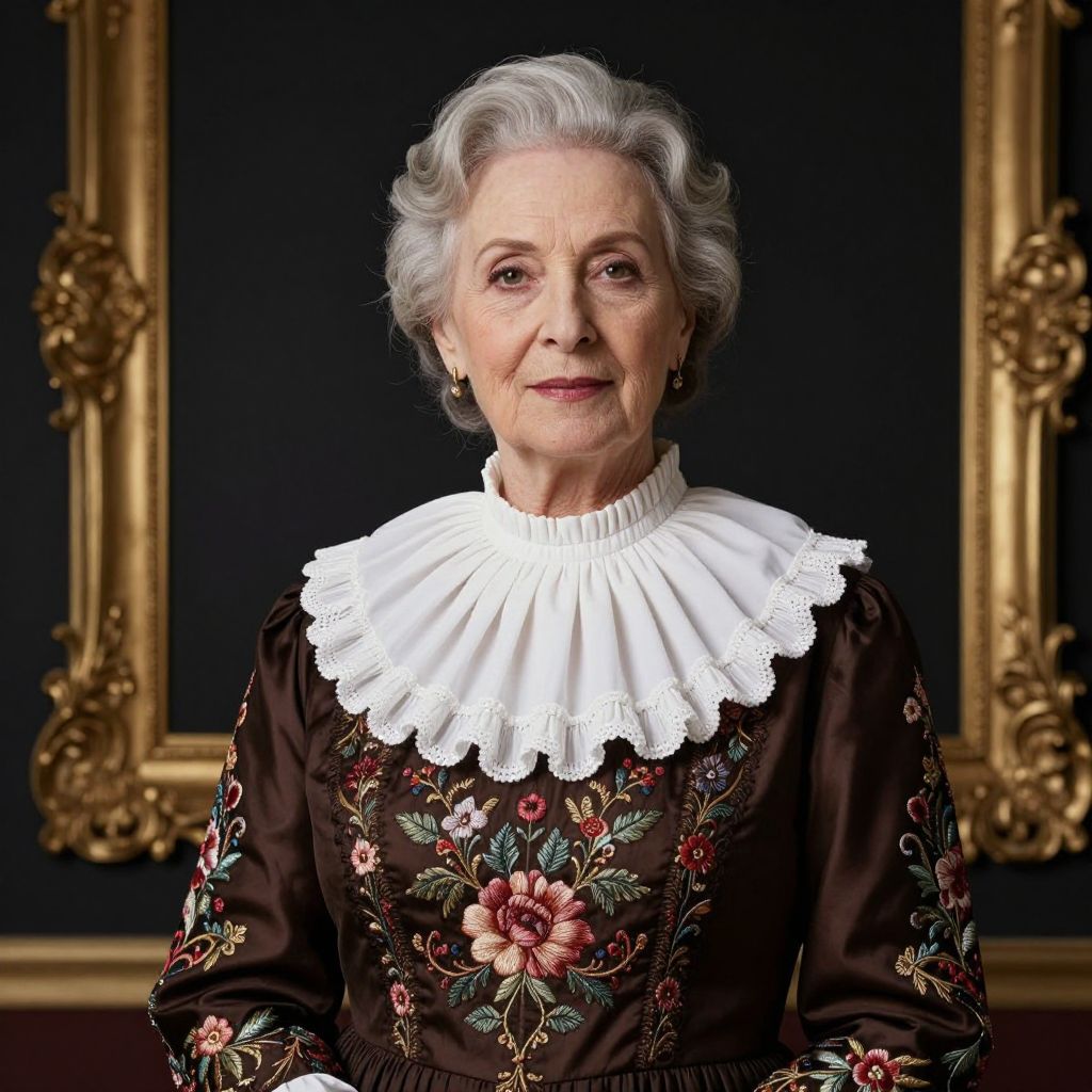 Elegant portrait of an elderly woman with gray hair, adorned in a richly detailed brown dress featuring floral embroidery and a crisp white ruffled collar, set against a dark background with ornate golden frame accents.
