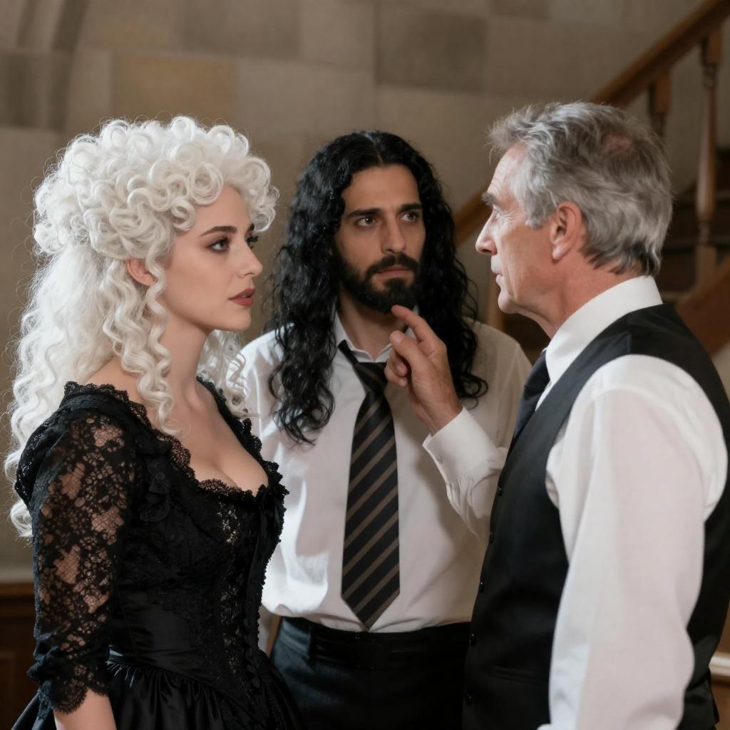 Photograph of three people in period costumes. Woman with large white curly hair, black lace dress, and low neckline. Man with long black hair, beard, white shirt, and striped necktie. Older man with gray hair, black vest, white shirt. Background: stone wall, wooden staircase. Older man touches man's chin. All have intense expressions.