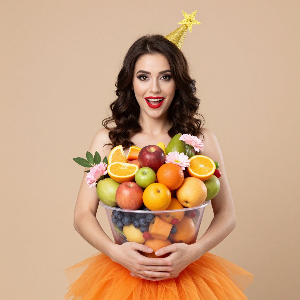 Fruit Cup Costume, woman holding a bunch of fruit and flowers